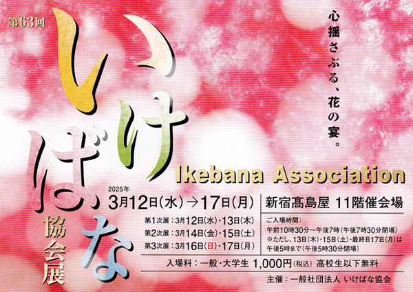 | 3/12 - 3/17 | 「第63回・いけばな協会展」 新宿高島屋 11階 催会場 / 新 宿 | |