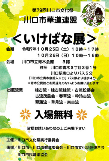 | 10/25-10/26 | 「第79回・川口市文化祭 いけばな展 」 川口市立青木会館 3階 | |