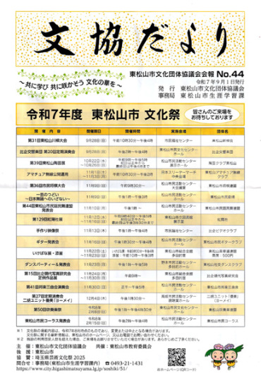 | 11/22-11/23 | 「令和7年度 東松山市文化祭・いけばな展 」 東松山総合会館/多目的室 | |