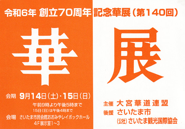 | 9/14 - 9/15 | 「創立70周年記念華展・第140回:華展」」 おおみやレイボックホール4階 | |