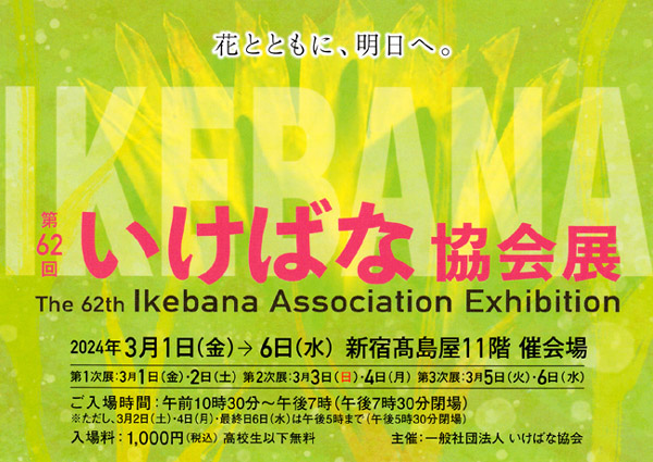 | 3/1 - 3/6 | 「第62回・いけばな協会展」 新宿高島屋 11階 催会場 / 新 宿 | |