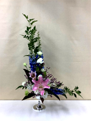 | 盛花は、口の広い比較的に浅い器を使用し、花留めに剣山を使います。 今日のいけばなのもっとも代表的な形式です。 初めていけばなを学ぶ人も比較的たやすく生けられます。 |