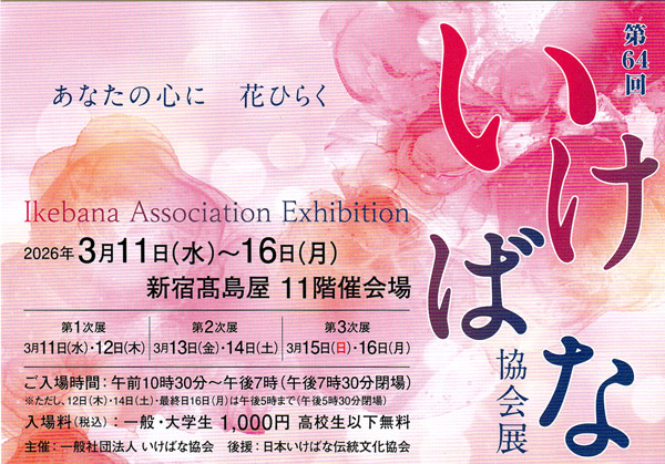 | 3/11 - 3/16 | 「第64回・いけばな協会展」 新宿高島屋 11階 催会場 / 新宿 | |